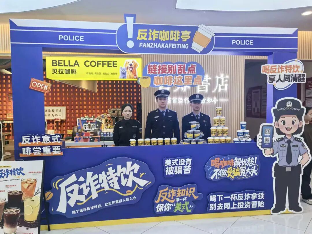 此外,在商场中厅设立"反诈咖啡亭"特色宣传点,将"未知链接不点击""陌生来电不轻信""转账汇款多核实"等反诈标语印制在咖啡杯上,制作"反诈特饮"系列饮品,通过"喝咖啡学反诈"的创意形式,让群众在放松休闲吧接受防骗知识。